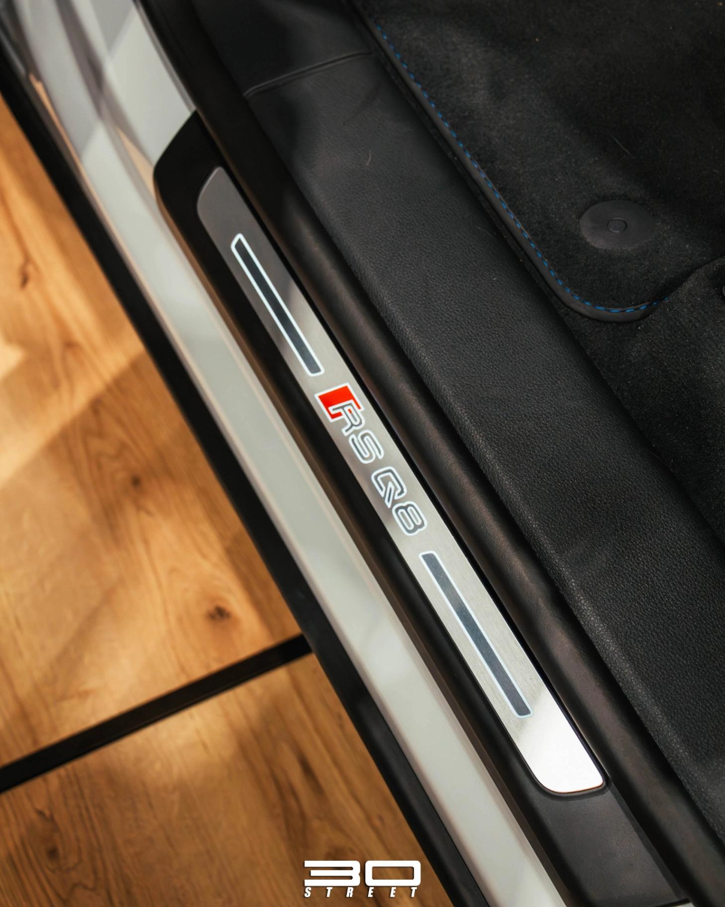 Al ingresar a este SUV RS encontramos molduras iluminadas con la insignia RS Q8