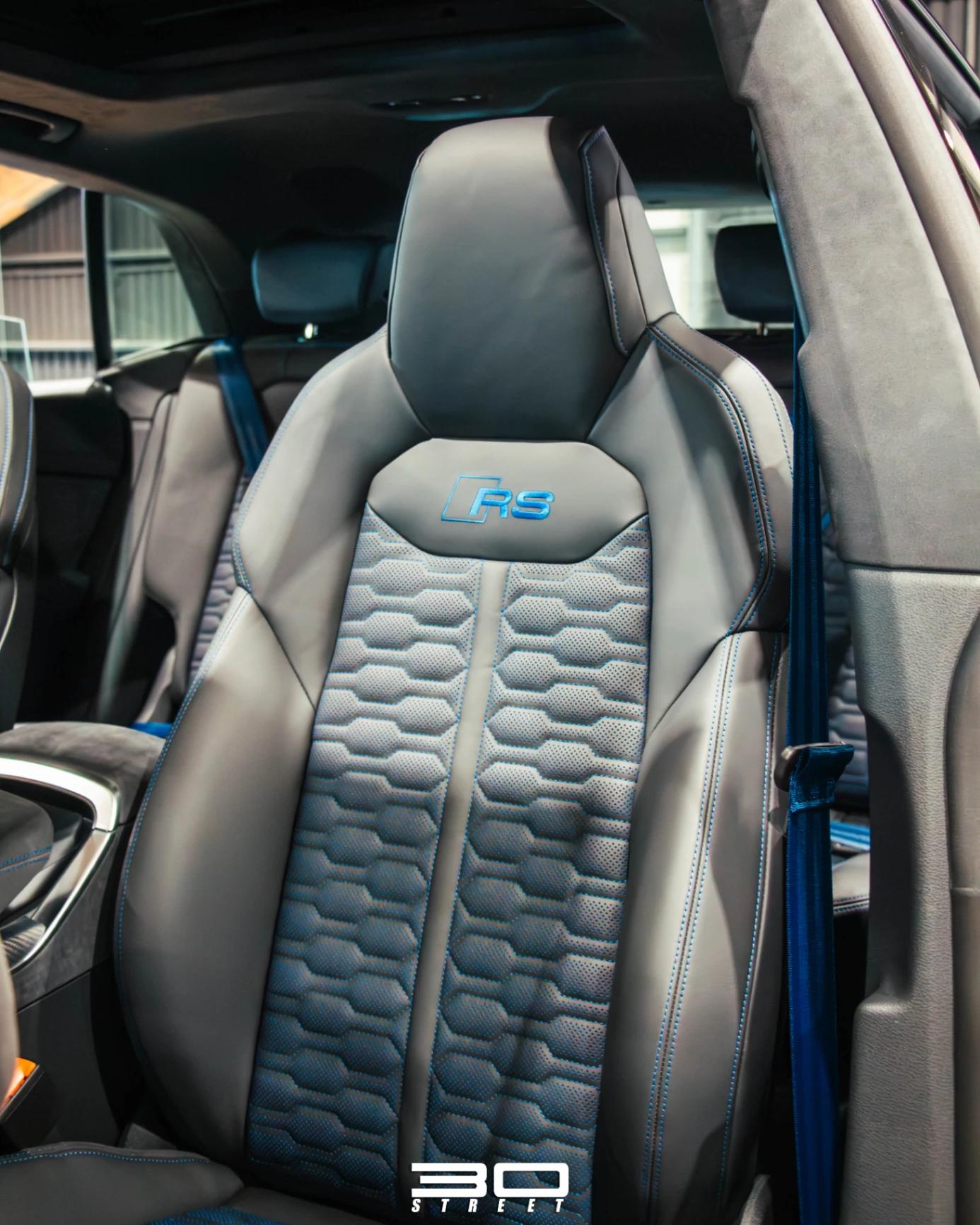 En cuanto a sus sillas deportivas plus están acabadas en cuero Valcona, perforadas con costuras en forma de panal y costuras azules especificas del paquete de diseño azul calefactados, estas sillas son ventilados de serie, con función de masaje disponible, acompañado de cinturones específicos en el mismo color que hacen juego con el resto de la tapicería