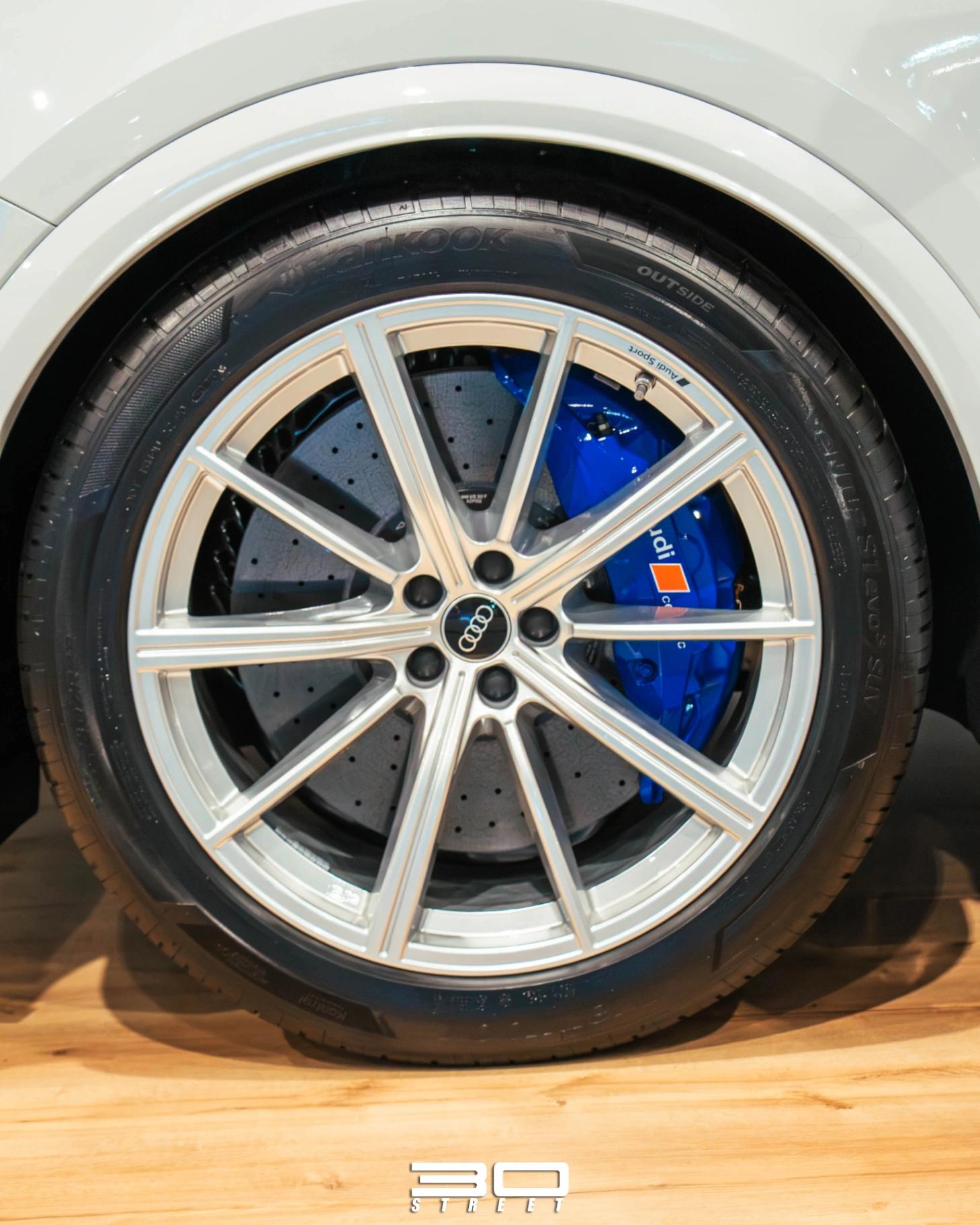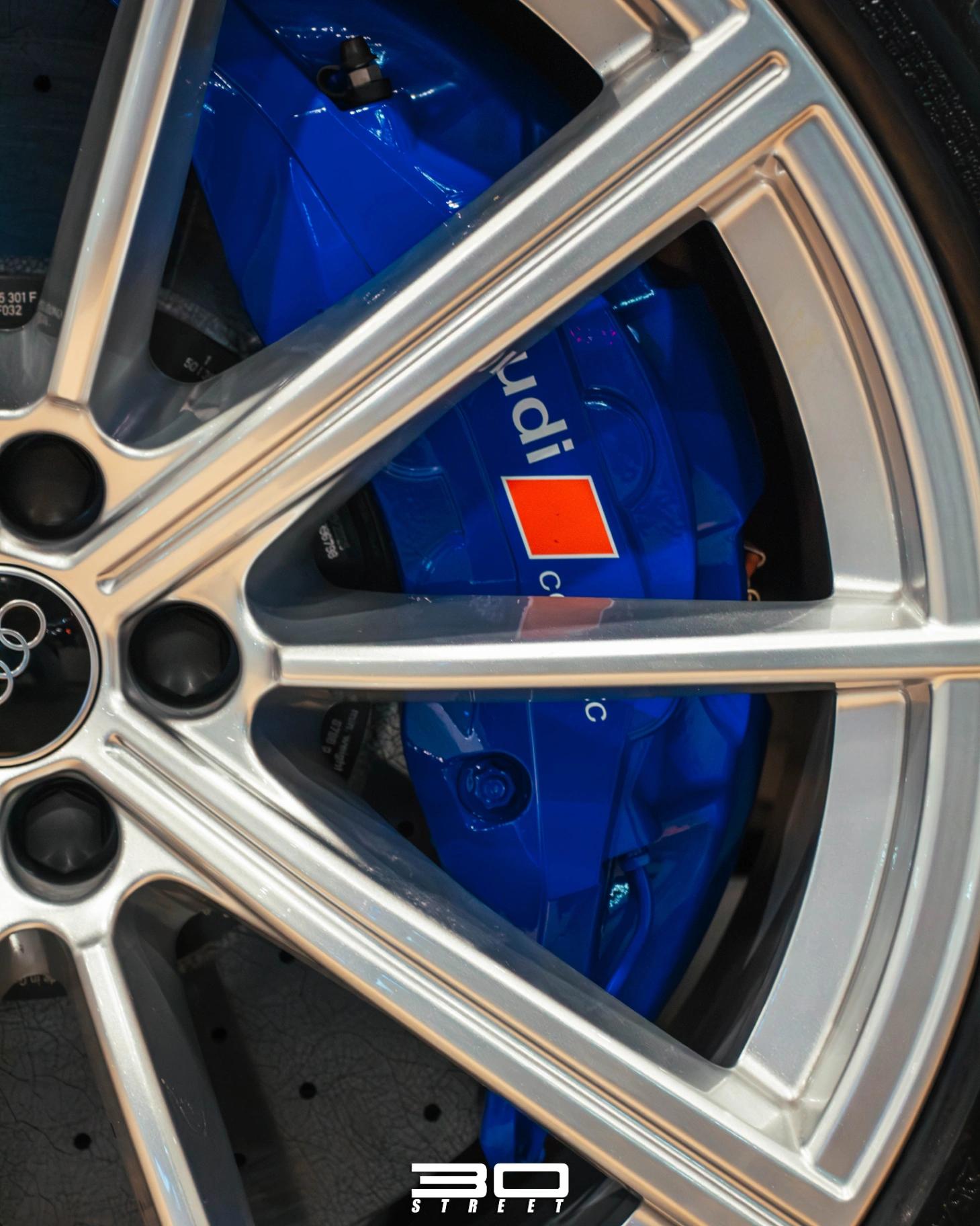 El RSQ8 Cuenta con un sistema opcional de frenos cerámicos delanteros y traseros con pinzas de freno en color azul que ayudan a reducir el peso no suspendido en cada esquina y disminuir la perdida de eficacia de frenado.
